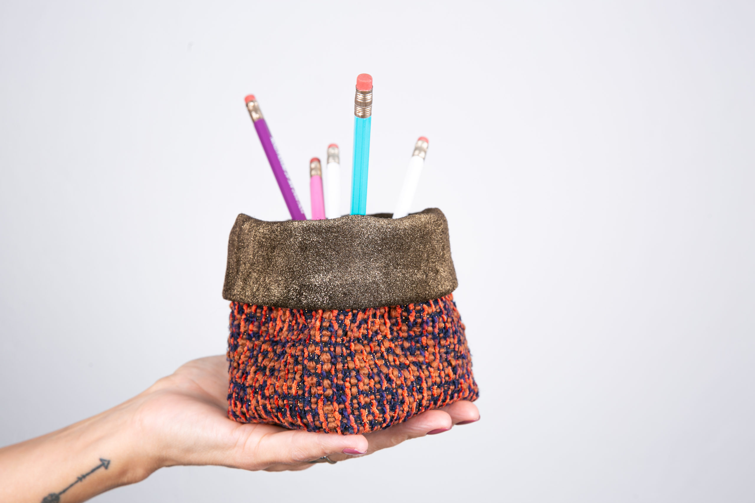 hand-sewn basket made by combining fabrics in contrasting patterns with the comfort of the leather.