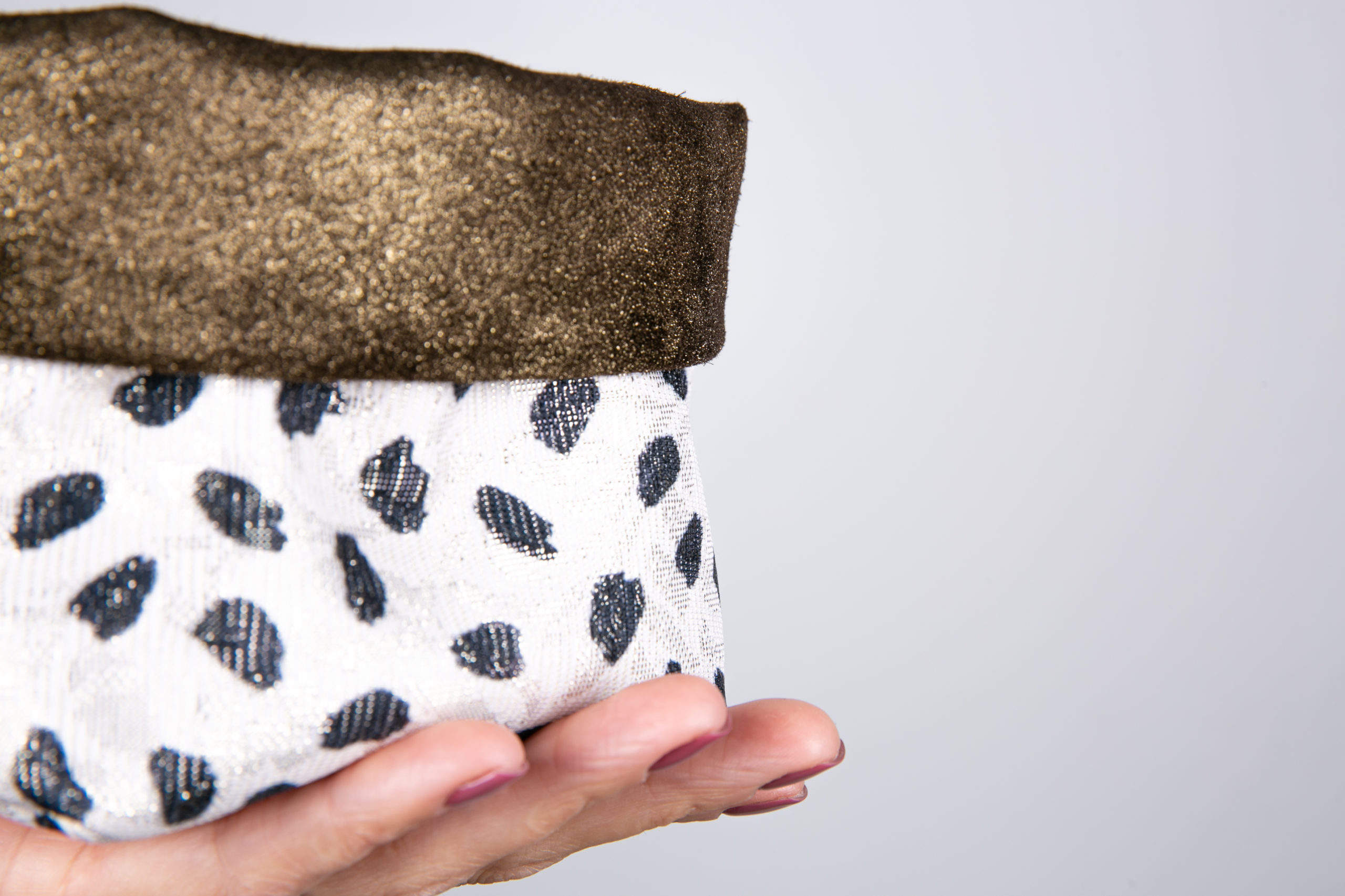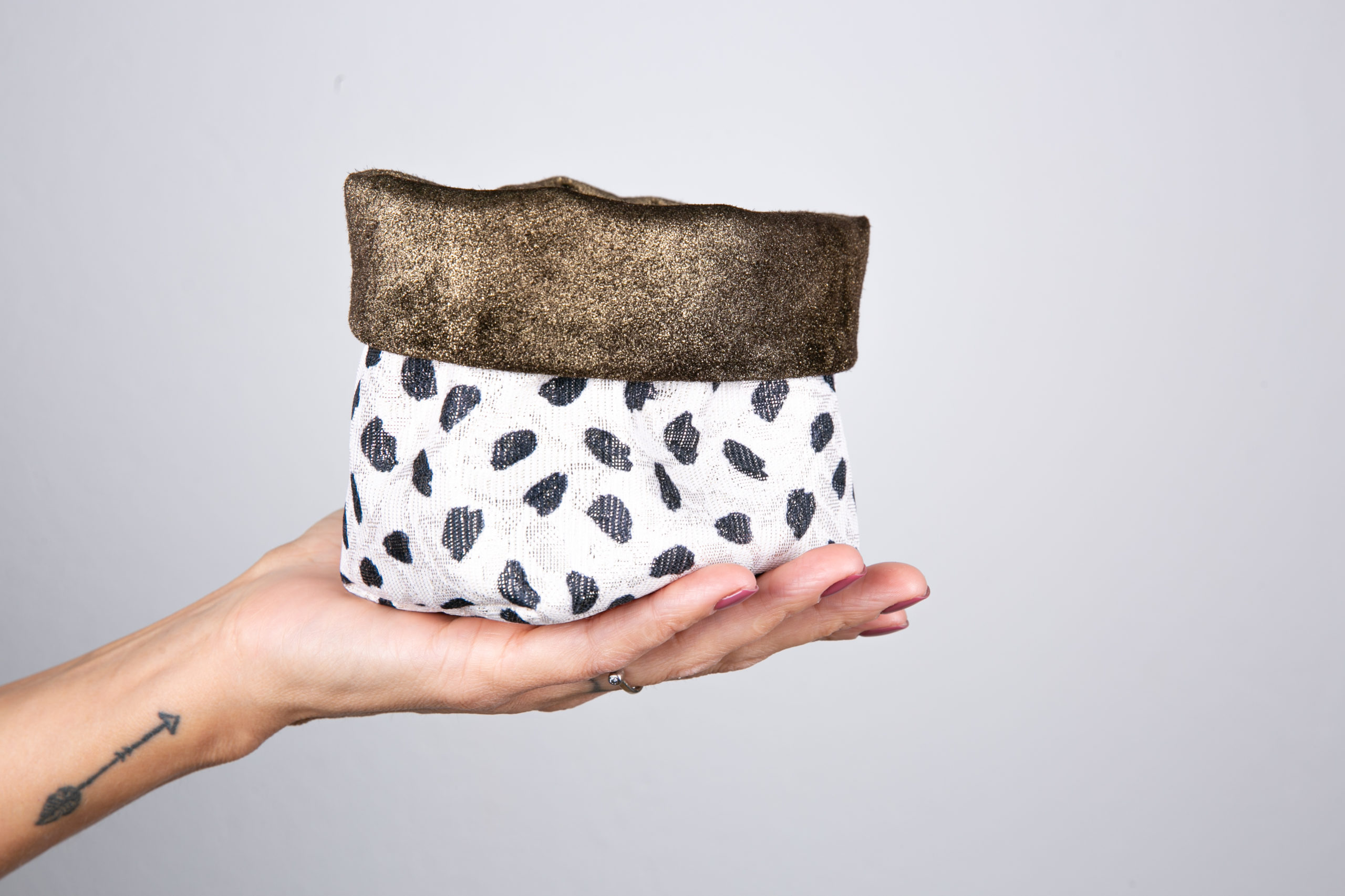 hand-sewn basket made by combining fabrics in contrasting patterns with the comfort of the leather.