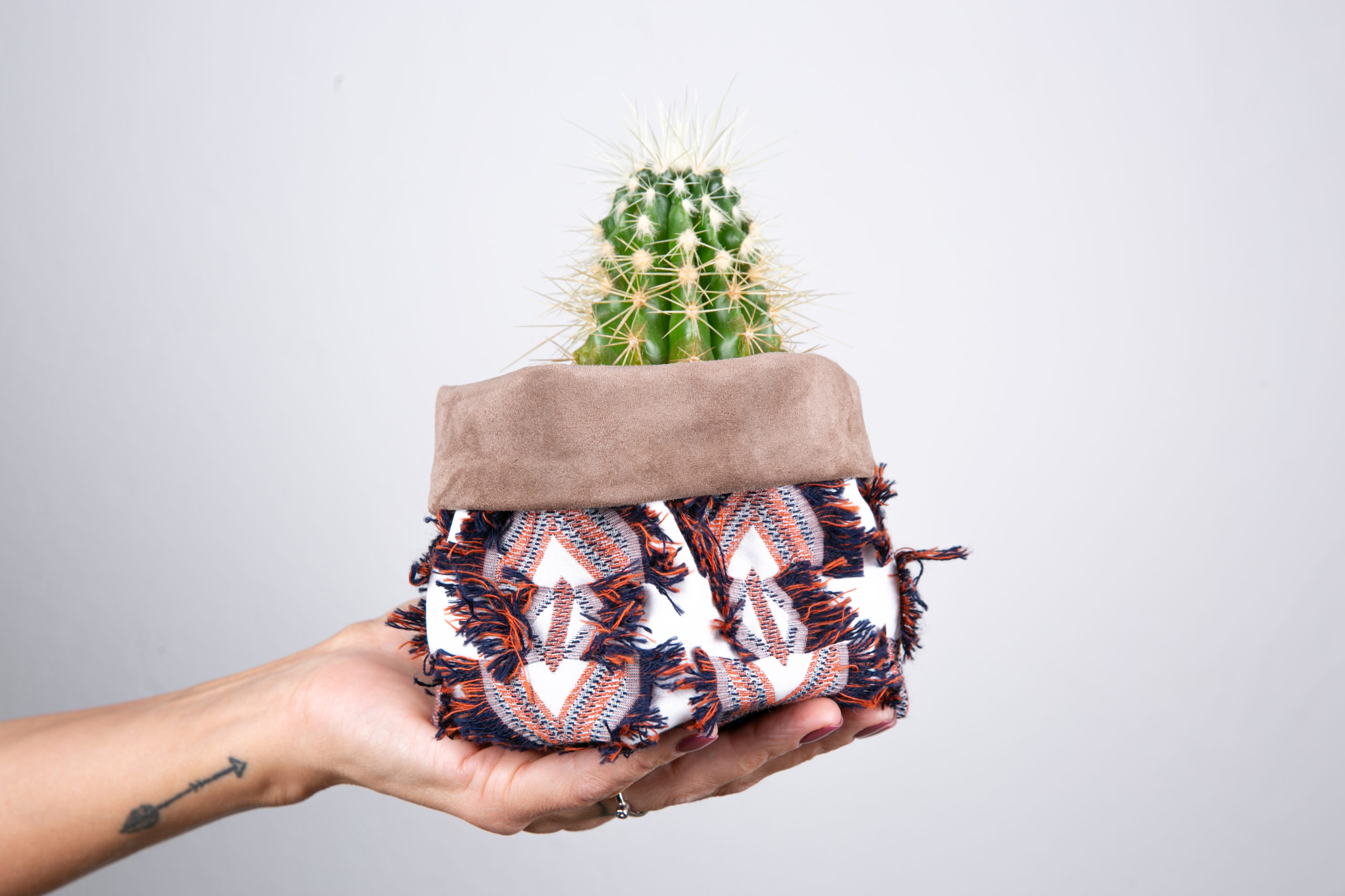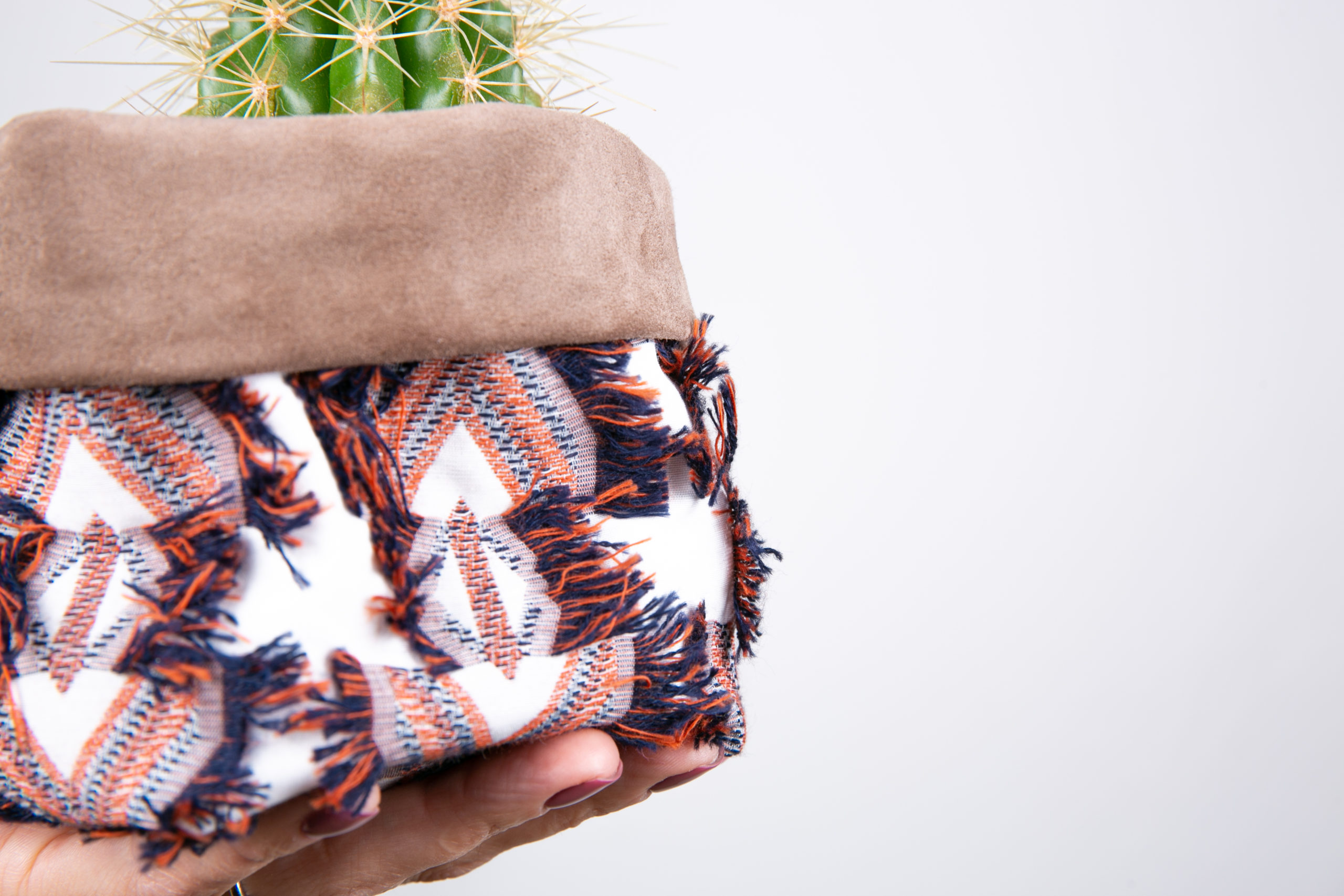 hand-sewn basket made by combining fabrics in contrasting patterns with the comfort of the leather.