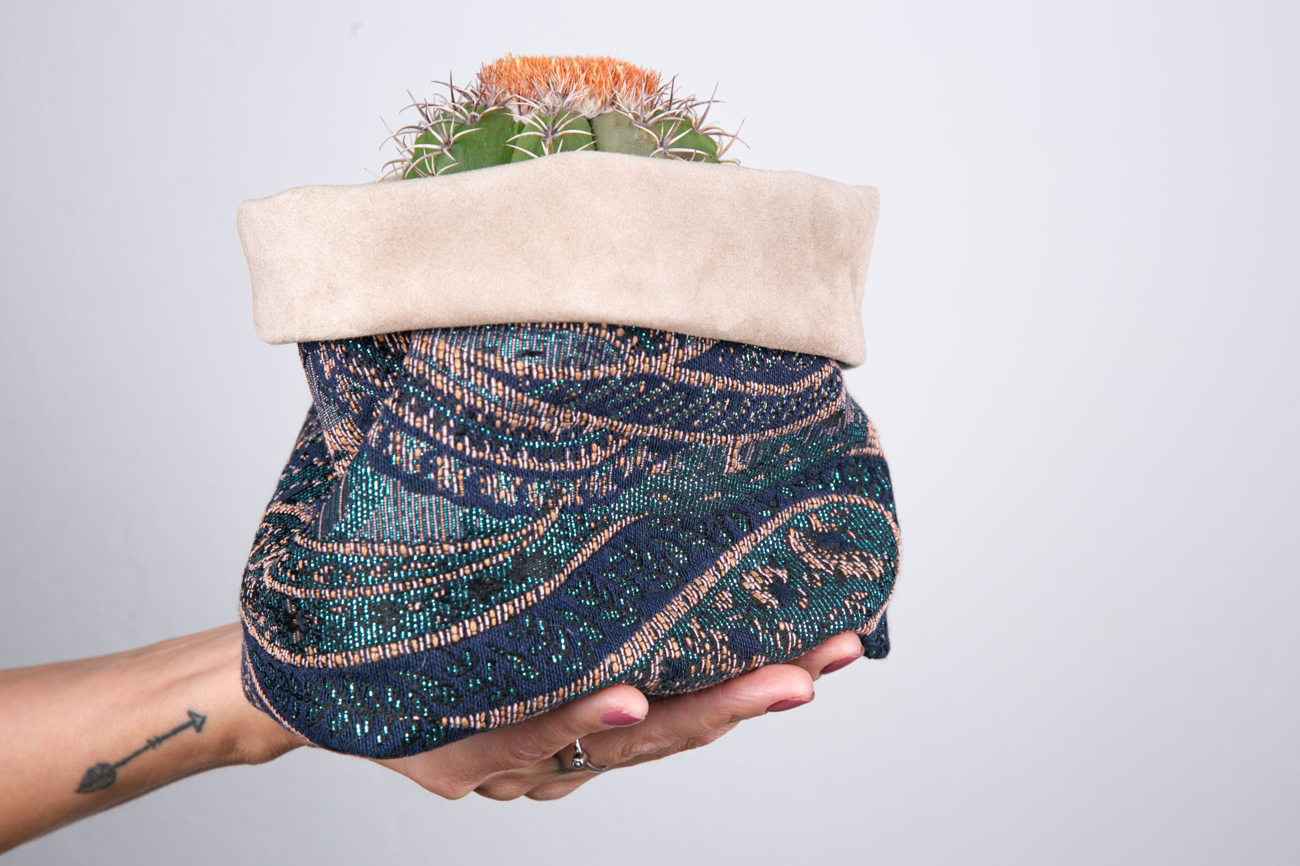 hand-sewn basket made by combining fabrics in contrasting patterns with the comfort of the leather.