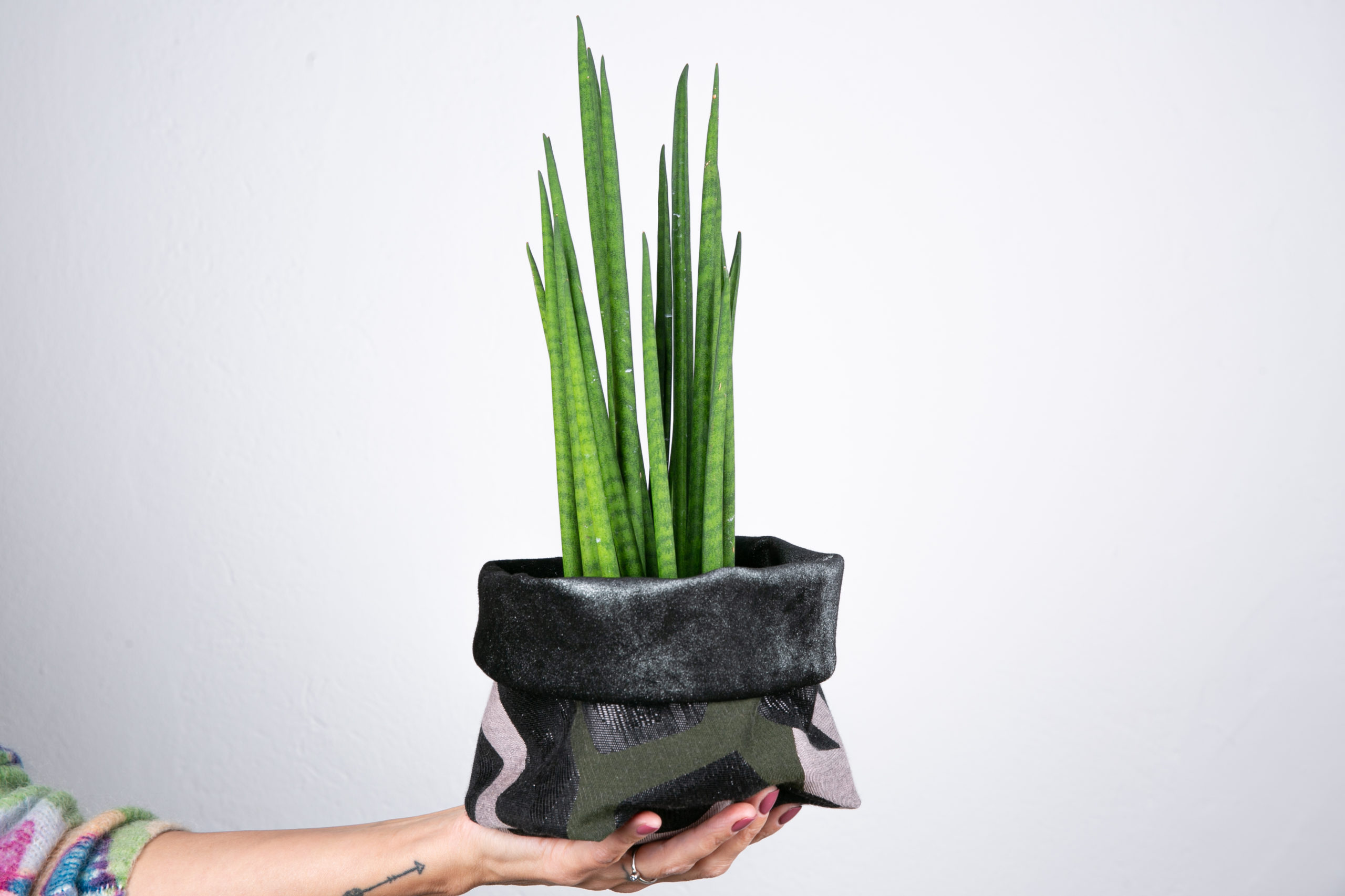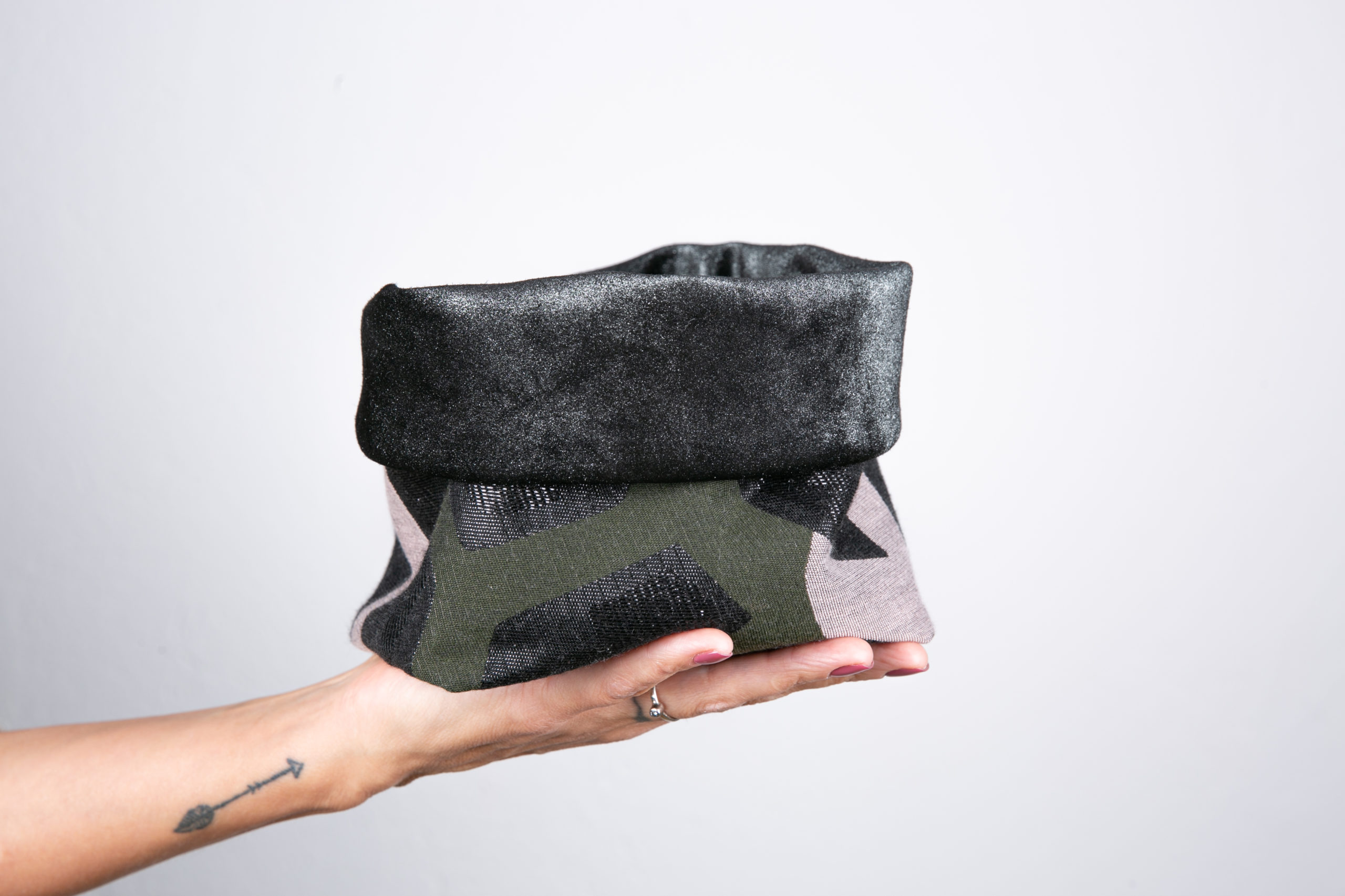 hand-sewn basket made by combining fabrics in contrasting patterns with the comfort of the leather.